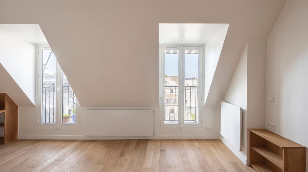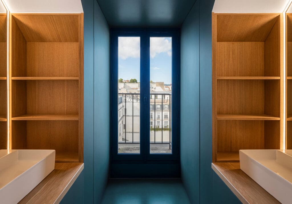 La salle de bain est conçue comme un dispositif orienté cadrant le paysage des toits parisiens.
