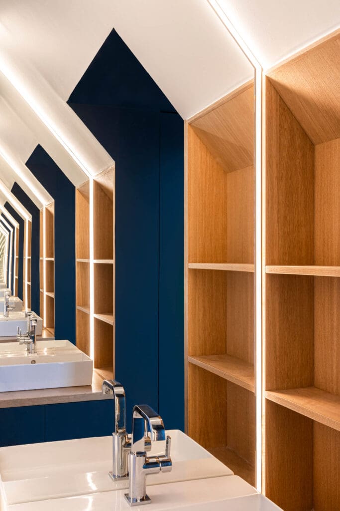 L’ensemble menuisé est plaqué d’une matière stratifiés vert bleuté, prolongeant la teinte des grandes dalles de carrelage. Les vasques se font face et les miroirs toute hauteur, bordés de rubans lumineux, produisent une réflexion à l’infini.