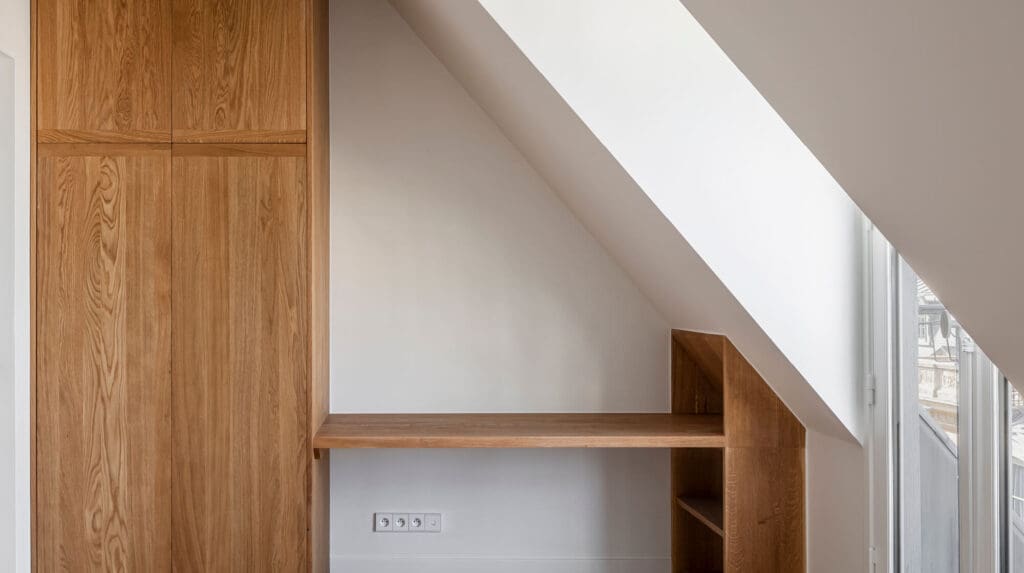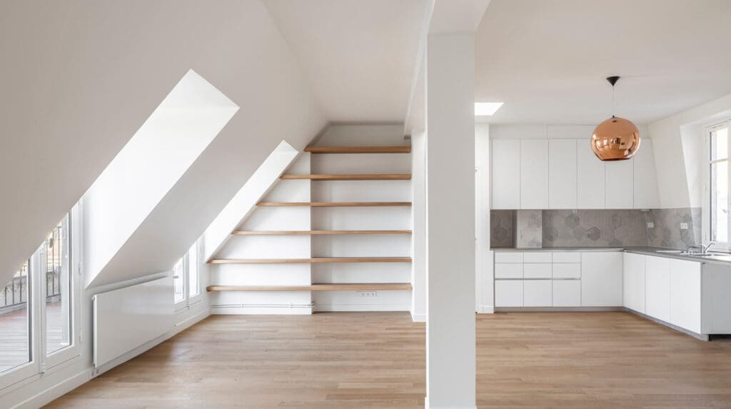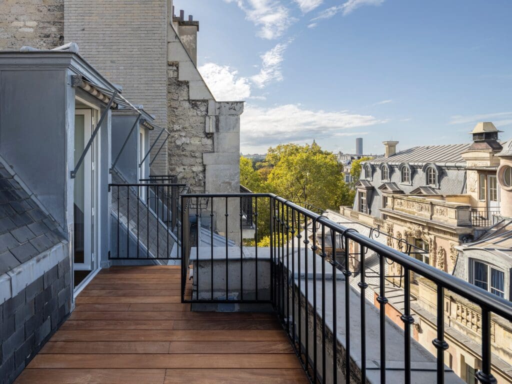 Pour profiter de cette vue, il fallait développer une terrasse suffisamment profonde pour y installer une table et des chaises. Cela a été rendu possible à l’issue de démarches auprès de l’architecte des bâtiments de France, des services d’urbanisme, mais aussi de la copropriété, à qui il a fallu préalablement racheter une portion de toiture.
