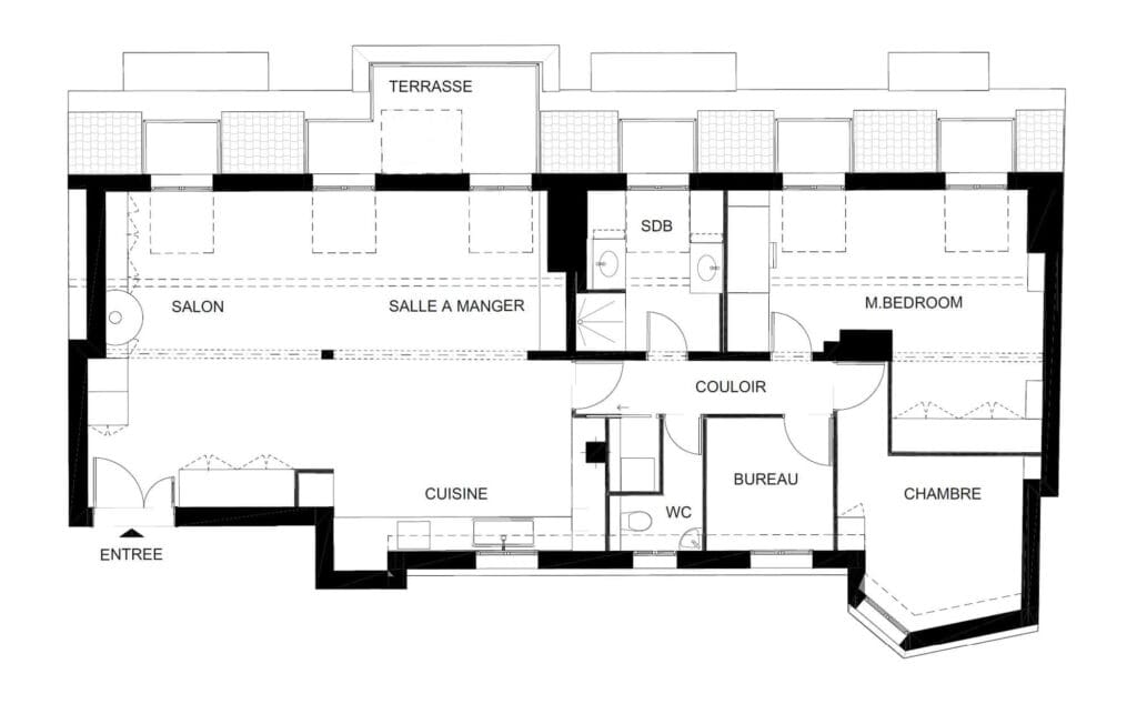 Développé pour un couple recevant ponctuellement enfants ou amis, l’appartement comporte une grande chambre principale ainsi qu’une chambre secondaire et un bureau fermé.