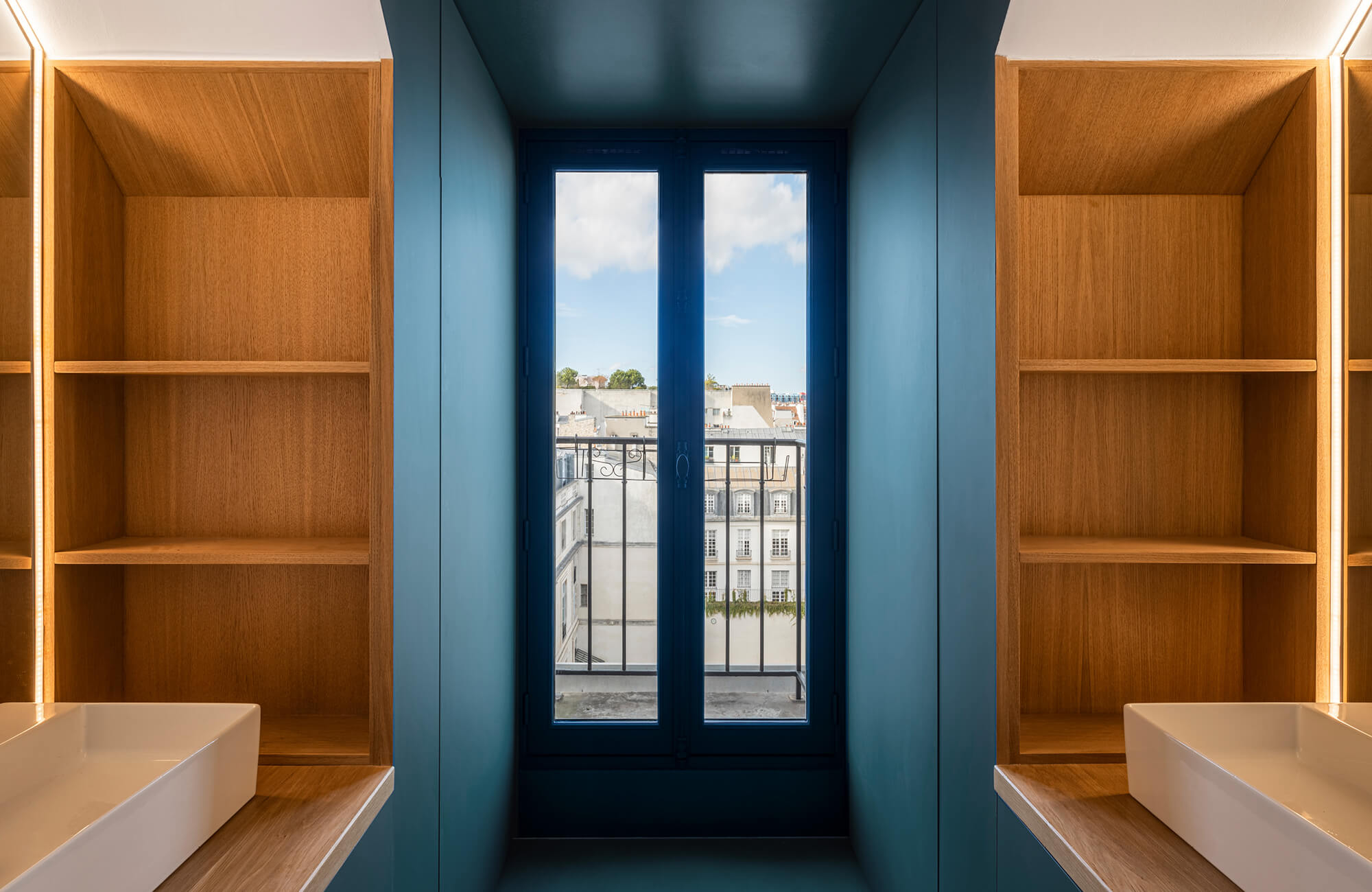 La salle de bain est conçue comme un dispositif orienté cadrant le paysage des toits parisiens.