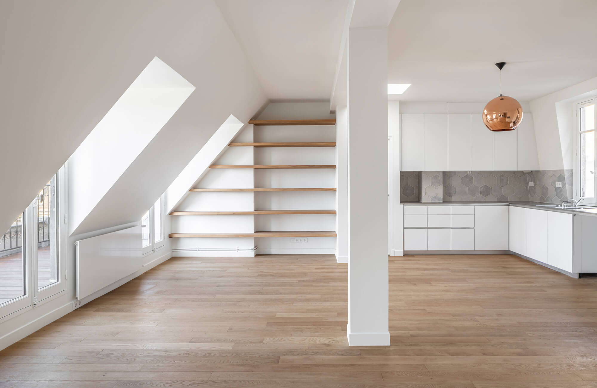 Pour dégager le volume du séjour, des reprises de structures ont permis d’éliminer l’un des poteaux ainsi qu’un voile porteur.