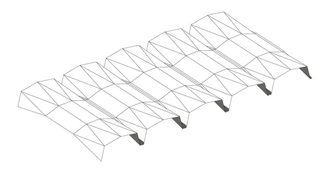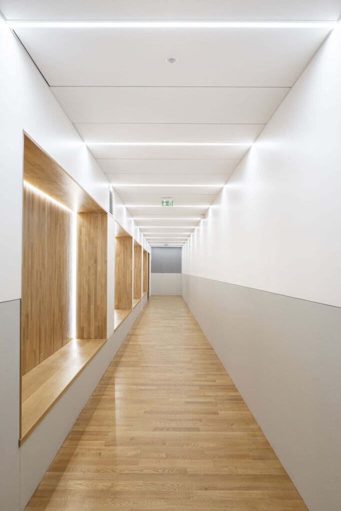 Les colonnes existantes côté Ouest, marquant la verticalité, sont reproduites sur le côté Est. Elles sont prolongées par un développement de facettes au plafond, formant une série d’arches favorisant une sensation de hauteur. L’ensemble a un revêtement à l’aspect minéral (Swisspearl).