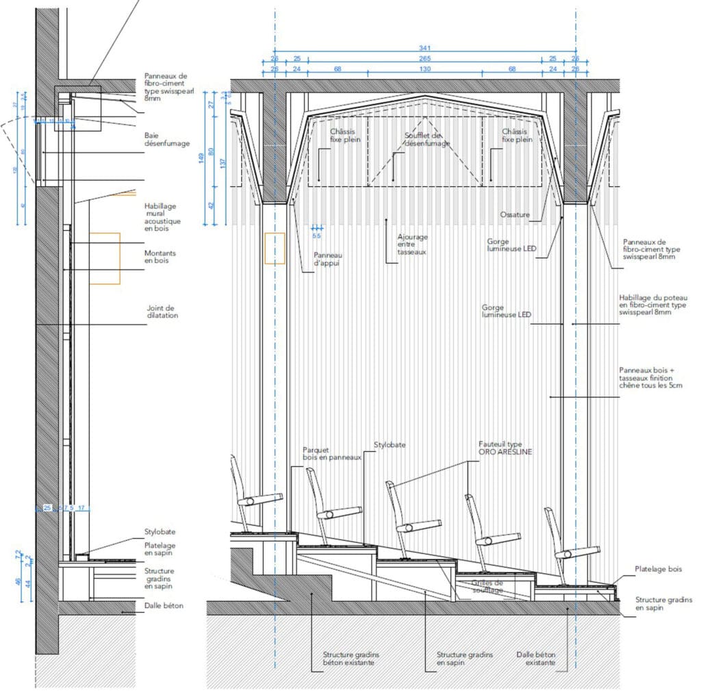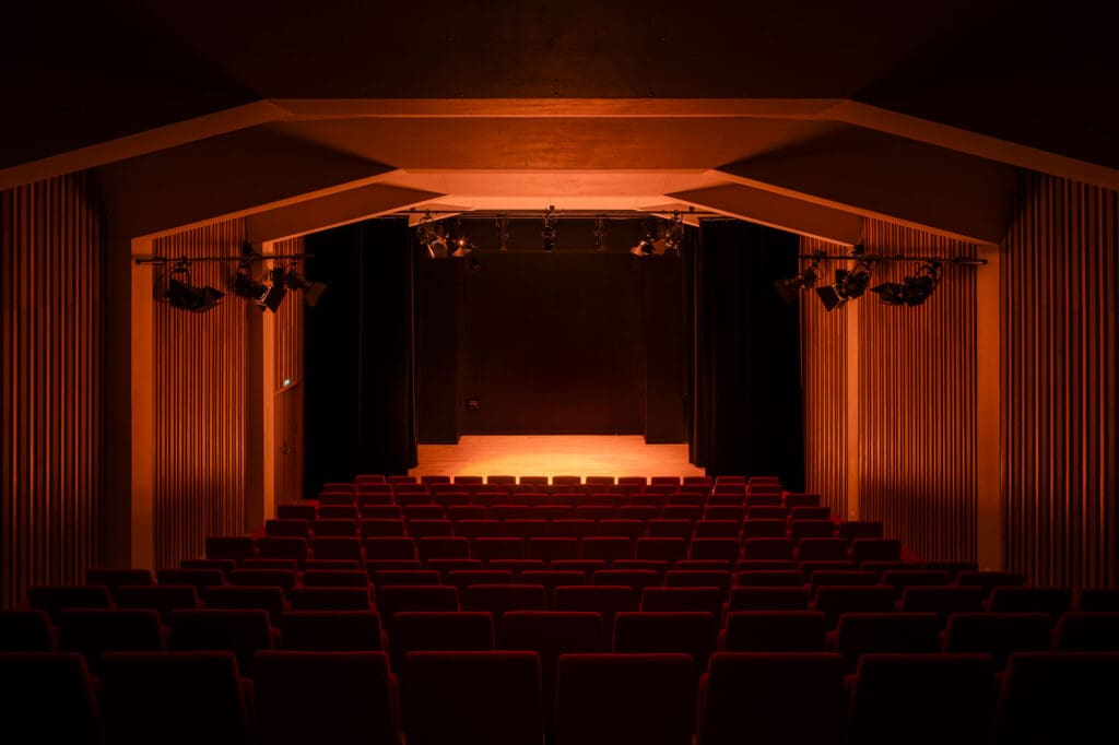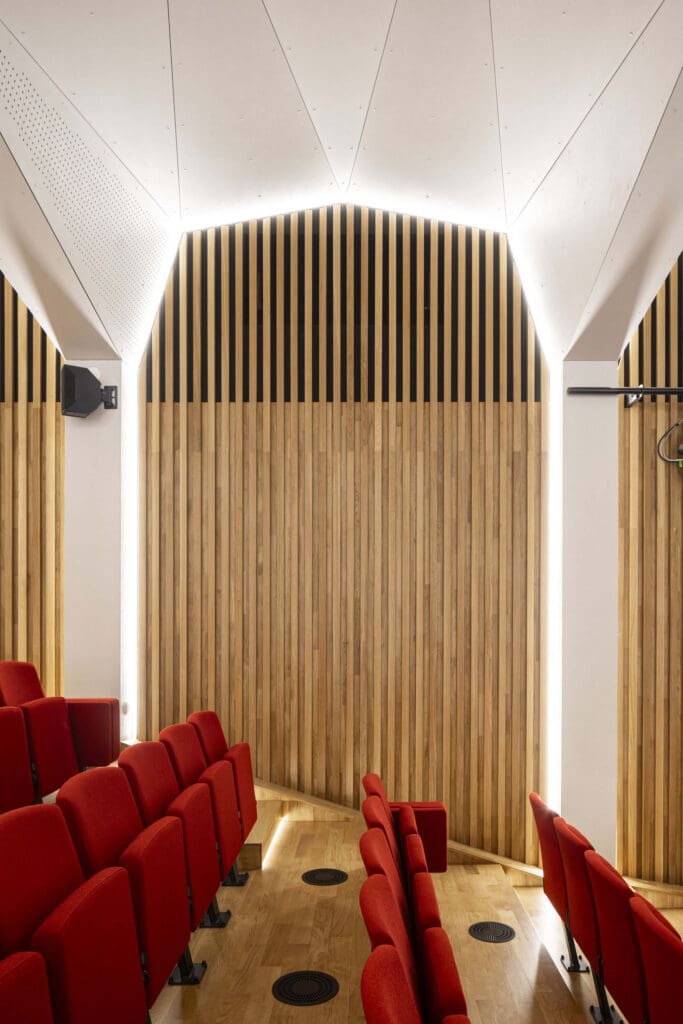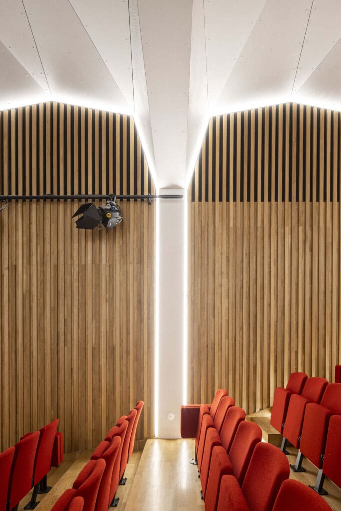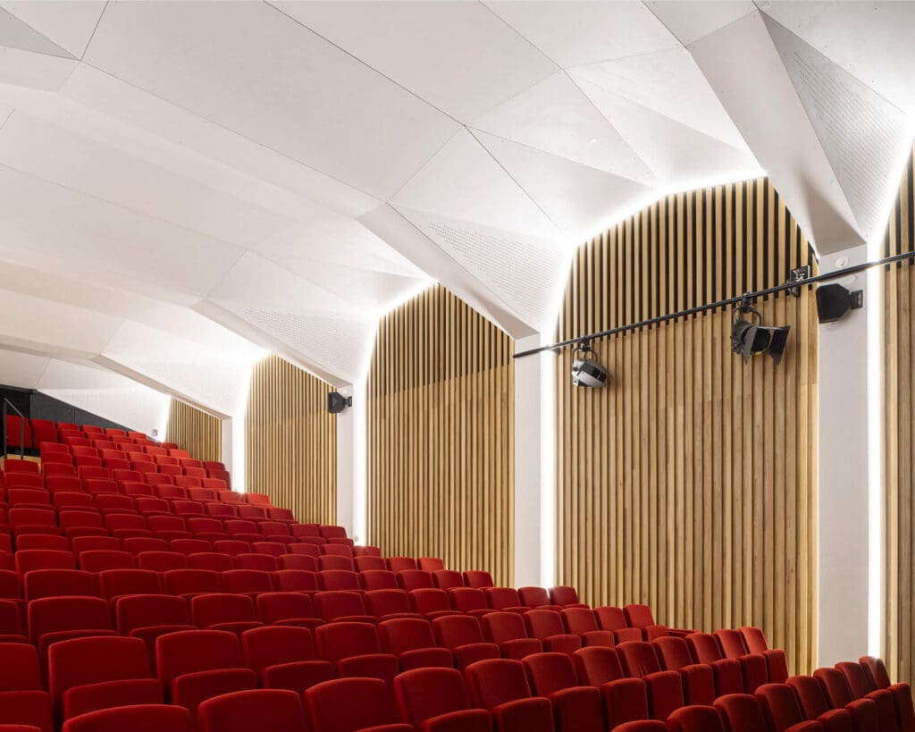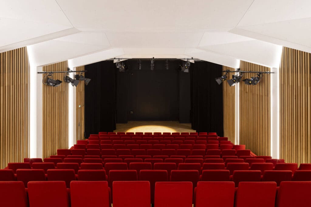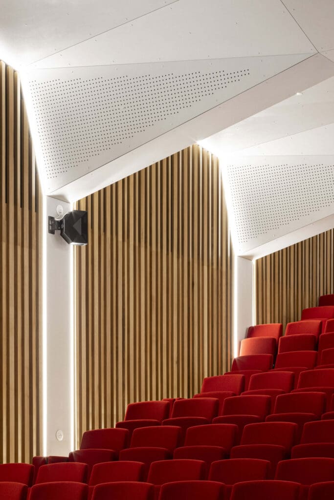 Les parois latérales reçoivent un revêtement en bois en lignes verticales, dont la découpe en facettes assure le traitement acoustique favorisant notamment l’intelligibilité de la parole et la musique acoustique comme amplifiée. L’auditorium est ainsi conçu pour un large panel d’usage : théâtre, conférences, concerts acoustiques, concerts amplifiés, projections.