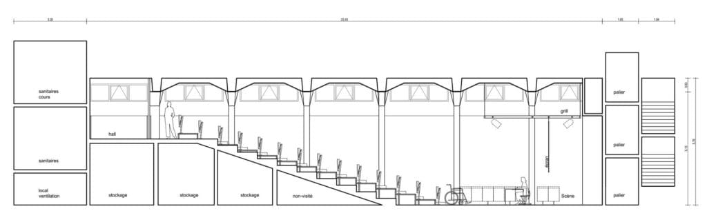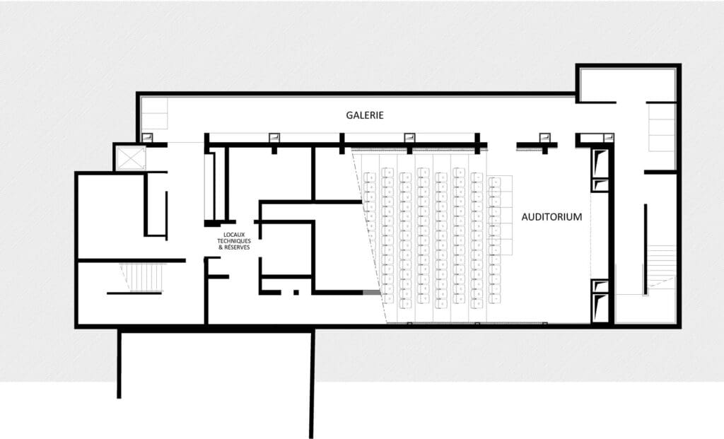 Notre proposition prend appui sur l’existant pour repenser globalement l’auditorium. Elle se fonde sur des améliorations fonctionnelles, sur une nouvelle lecture du volume disponible, et sur la recherche d’une image distinguée, contemporaine, et singulière. Une galerie est creusée le long du volume préexistant pour permettre un accès supplémentaire ainsi que la création de vestiaire et régie côté scène.
