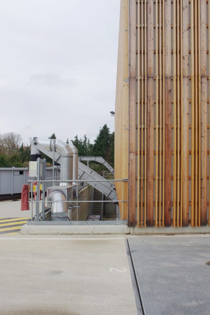 Son volume est traité de sorte à rompre avec l’image habituelle des objets techniques, tout en formant une unité paysagère avec le contexte. Le bardage en bois apposé aux façades confère au volume une impression de légèreté et de transparence afin de faire perdre la perception de son échelle monumentale.