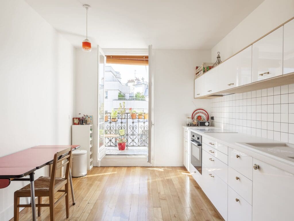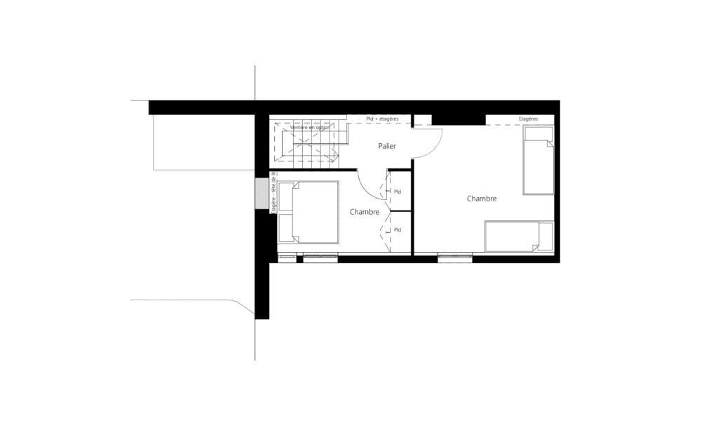 Ils s’agissait de repenser un duplex pour un ménage et deux enfants. La position des pièces est nouvelle : grande cuisine au sud dotée d’un balcon, grand séjour ouvert à l’est. Les chambres sont à l’étage, reliées au salon par un nouvel escalier rendant les déplacements fluides.