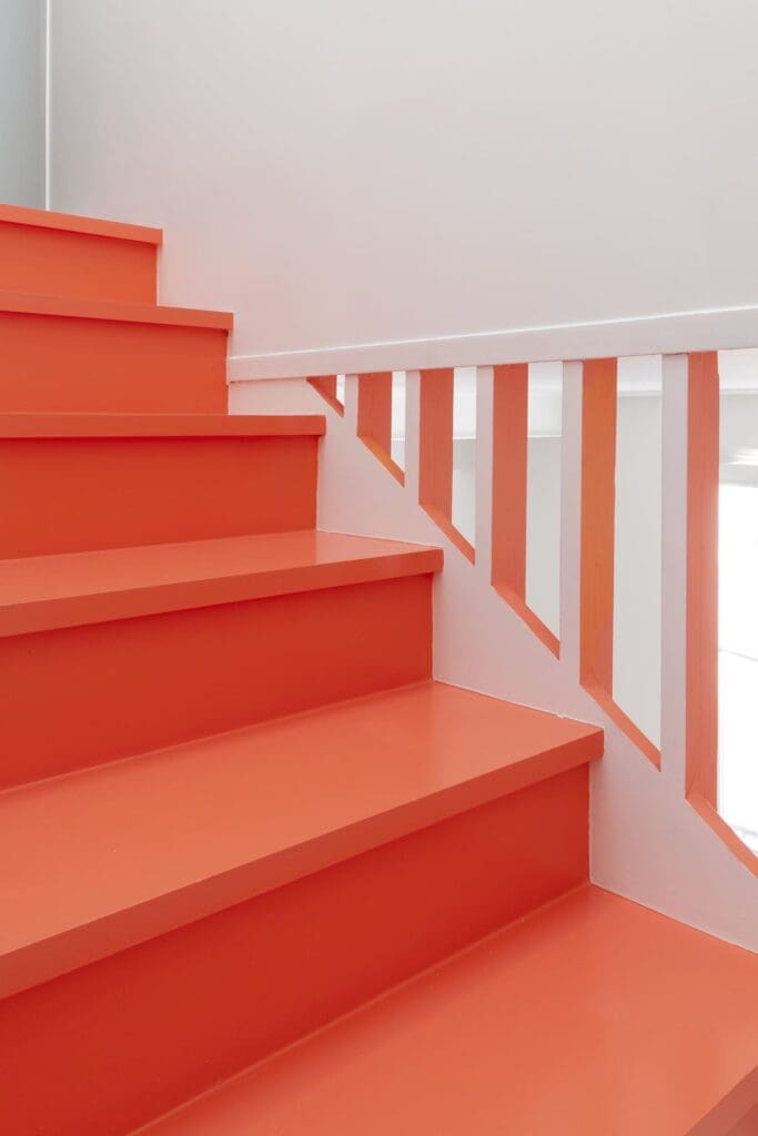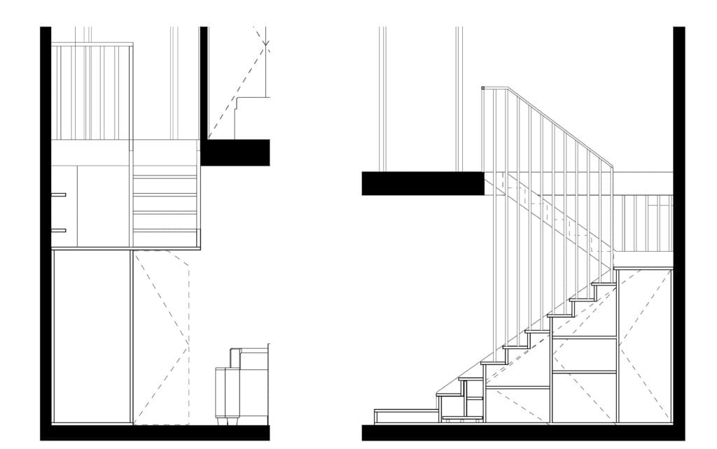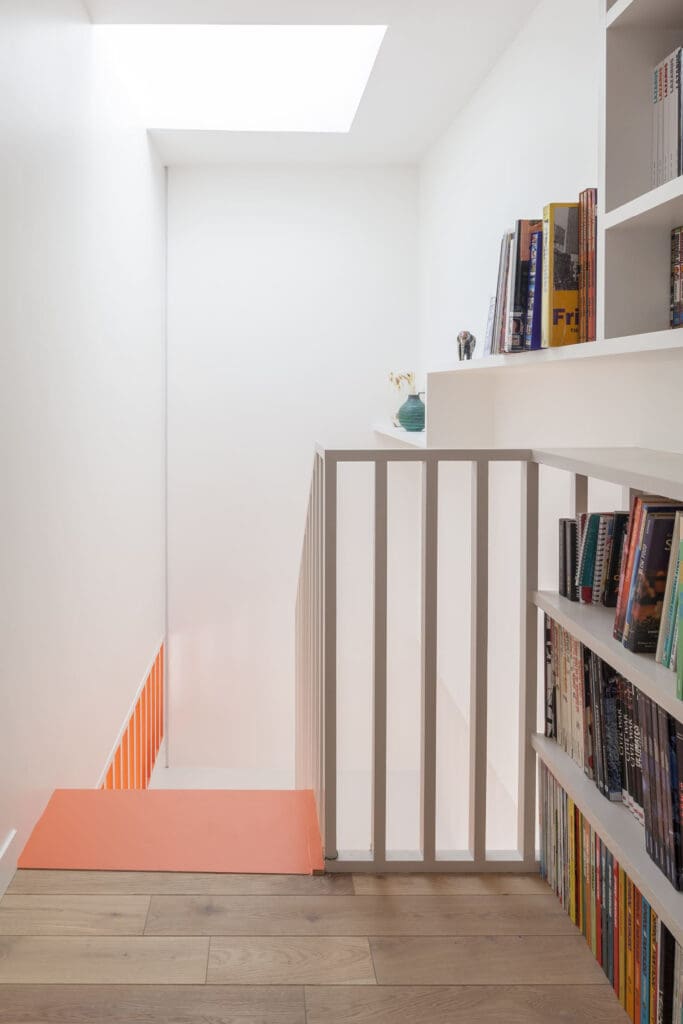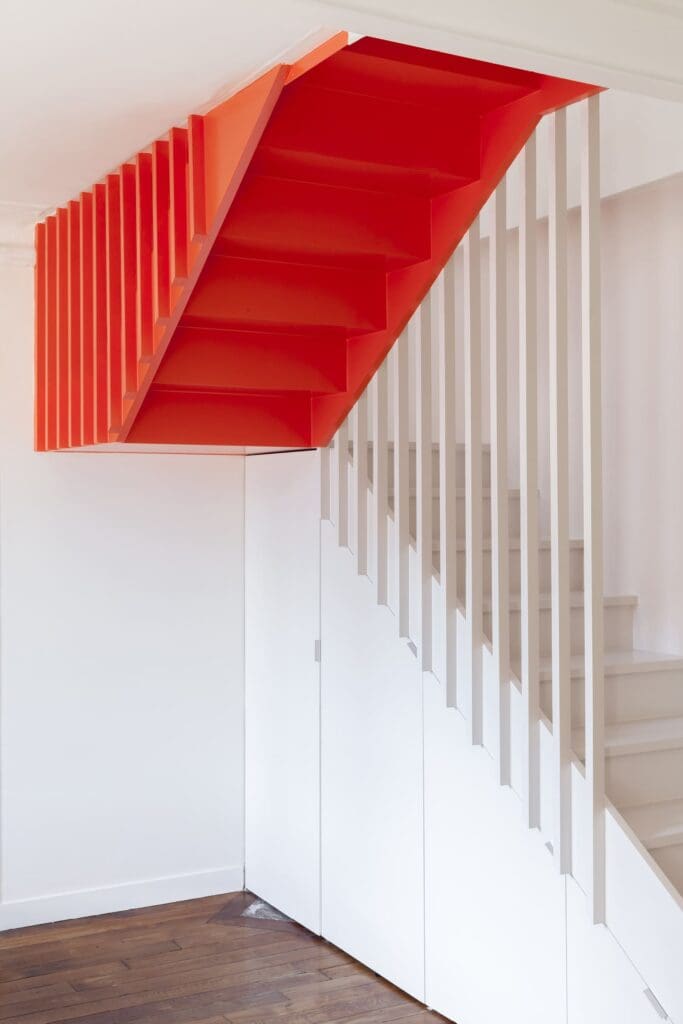 Cet escalier en bois peint est également un meuble de rangement optimisé. Mais a delà de ces fonctions, il s’agit aussi d’un lieu de vie à part entière bordé d’étagère et surplombé d’un percement zénithal apportant une lumière nouvelle. Cet objet marqué de verticales assemble deux masses : la partie basse est traitée en brun clair, proche du blanc du séjour. La partie haute, élaborée comme un volume suspendue est traitée au contraire peinte d’une couleur vive et défie la pesanteur.