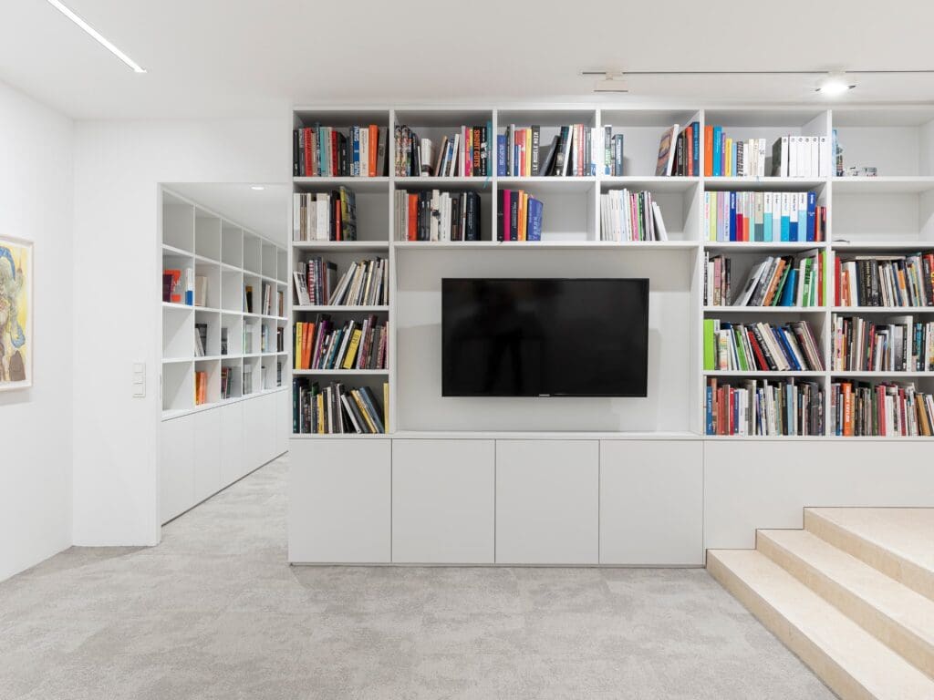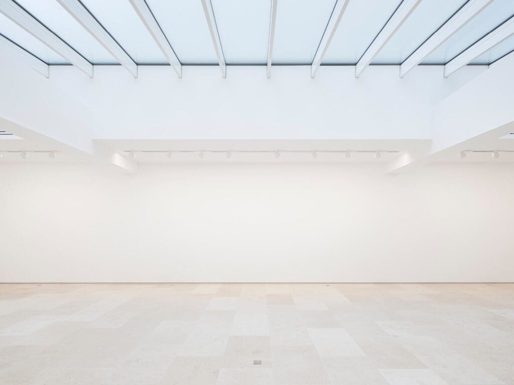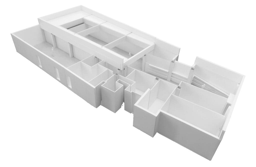 Pour fabriquer ce volume, il fallait délimiter cet espace par des cloisons rattrapant l’oblique de la parcelle, et lui donner la meilleure hauteur possible sous plafond au profit de l’accrochage d’œuvres hautes. Le retroussement de poutres longitudinales en béton existantes, qui parcouraient le volume dans la longueur, a permis cette optimisation.