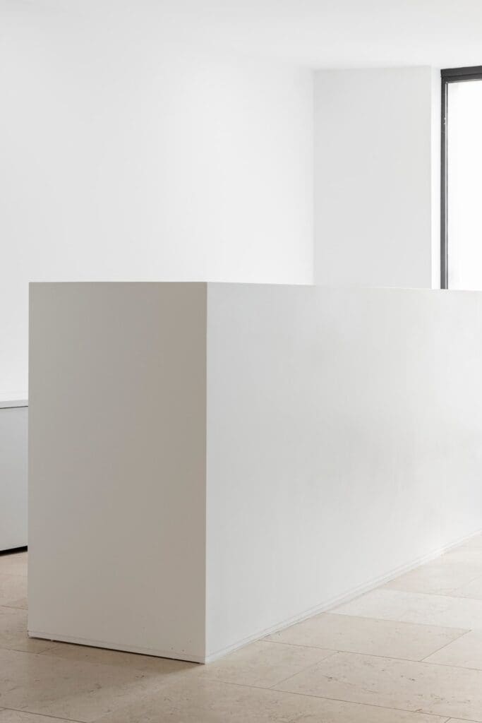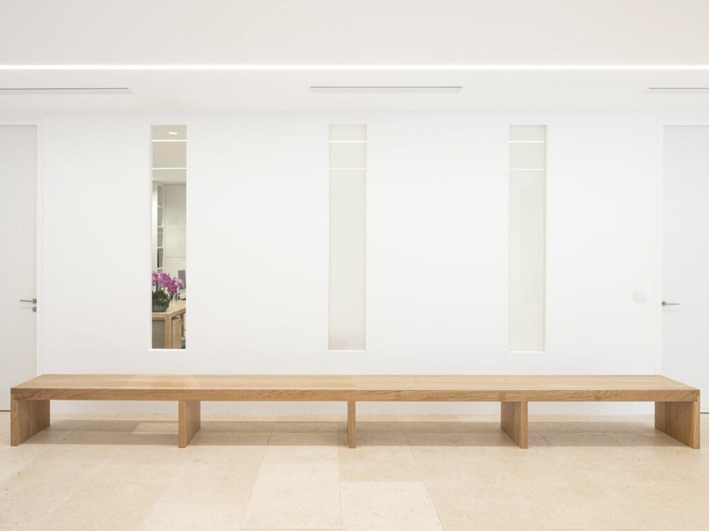 La rationalisation des réseaux de ventilation, de chauffage et d’éclairage, comportant des trappes et des grilles fabriquées sur mesure pour une meilleure dissimulation, a prolongé cet effort d’effacement au profit d’un espace épuré.