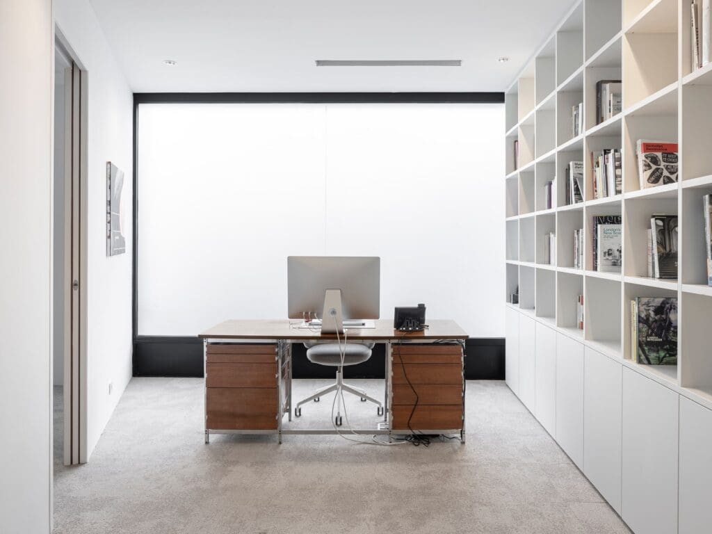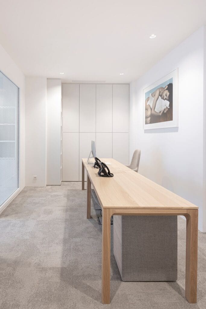 Les bureaux ont le même traitement que les salons privé ; leur sol en moquette reçoit la lumière douce d’un éclairage de qualité. Ils sont dotés de parois menuisées intégrants des placards, étagères et bibliothèques épurés.