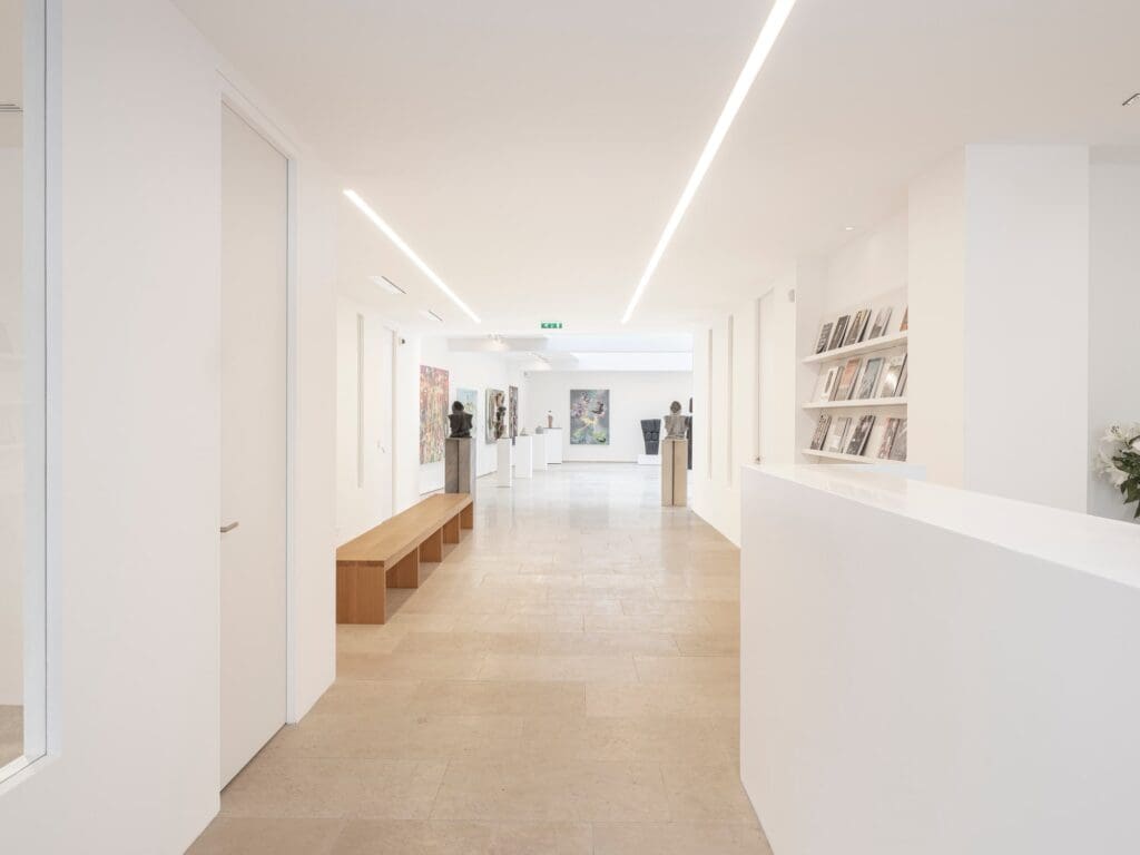Conçu comme un entonnoir retardant, pour les mettre en valeur, l’accès aux expositions, l’espace d’accueil est meublé d’un côté, d’une banque d’accueil en corian blanc et à l’opposé, plus loin, d’un long banc en chêne massif de 5,30m de long. Deux bandes lumineuse viennent au plafond à leur aplomb pour structurer cette entrée.
