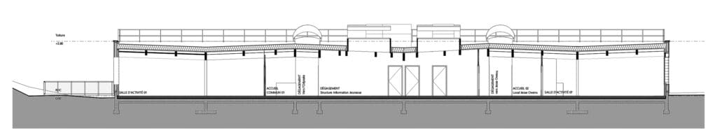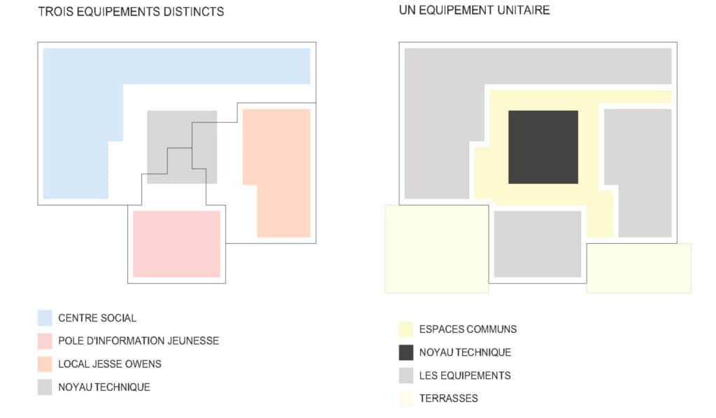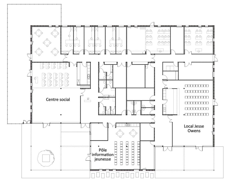 Au delà de la réponse fonctionnelle aux trois équipements le constituant, nous avons conçu un bâtiment unitaire, porteur de convivialité par la clarté et le soin apporté à ses espaces communs, et capable de fonctionner à la fois en entités séparées, et en un seul équipement lisible et cohérent.
