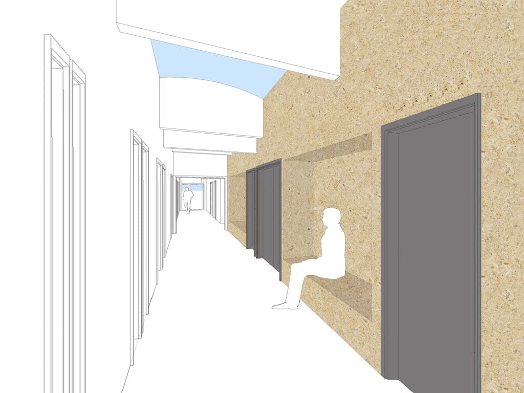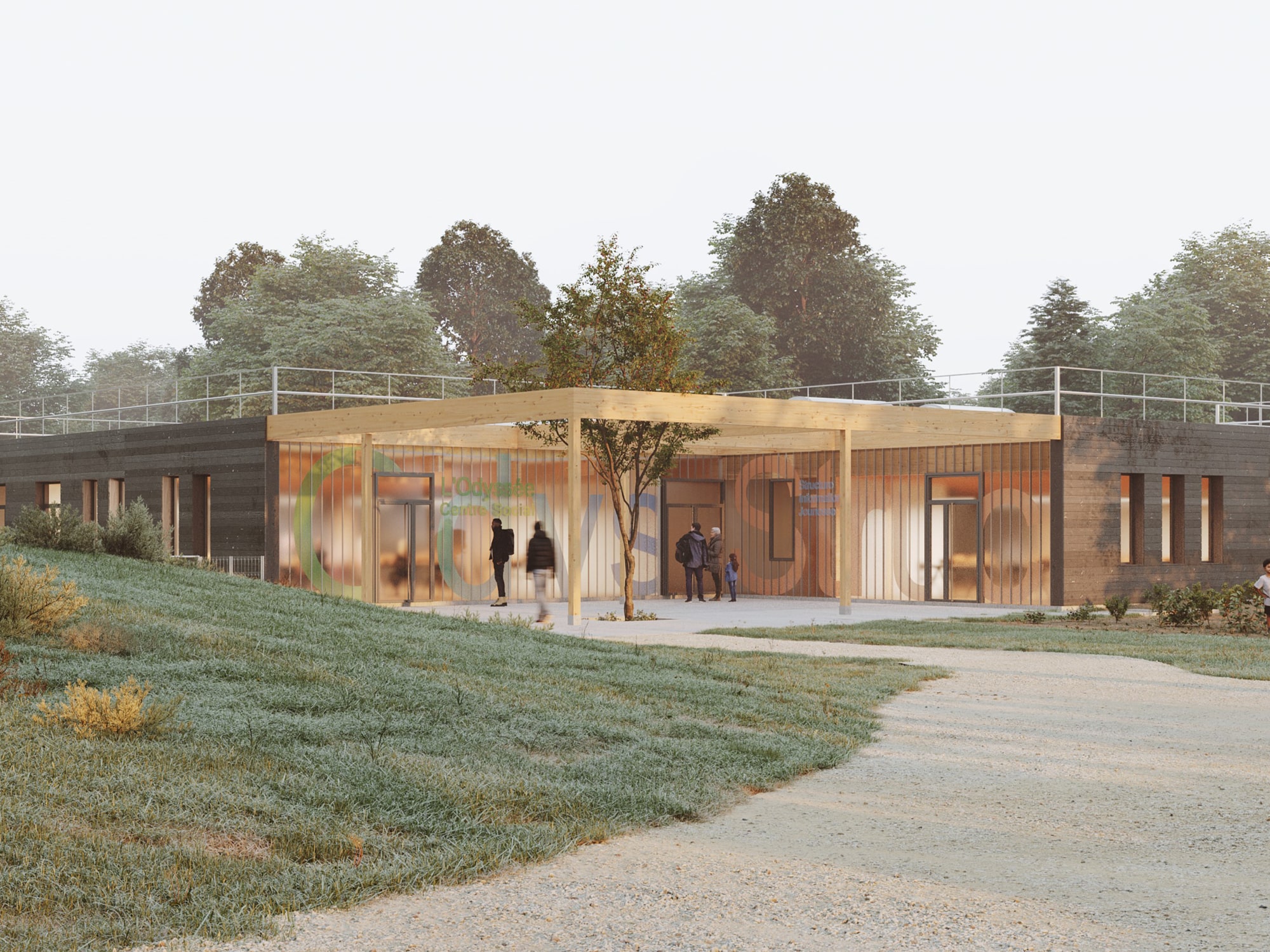 Notre projet ouvre ainsi une « placette » à l’angle sud du bâtiment, entrelacée avec le parc, pour inviter le visiteur, à s’acheminer vers l’équipement social et accéder à l’accueil commun. Cette placette ouvre les salles polyvalentes du centre social et du pôle d’information jeunesse vers le sud au travers de parois en profilit translucide. Un jardin potager est positionné dès les abords de l’équipement sur son côté sud-ouest. Des jardins protégés jouxtent les salles d’activité du centre social.