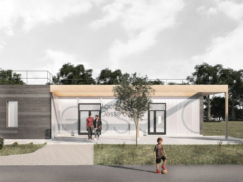 Les utilisateurs du local Jesse Owens auront leur placette indépendante, qui creuse à son tour le bâtiment au sud-est, en regard sur les terrains de sport. Les placettes sont reliées par un réseau de circulation intérieur.