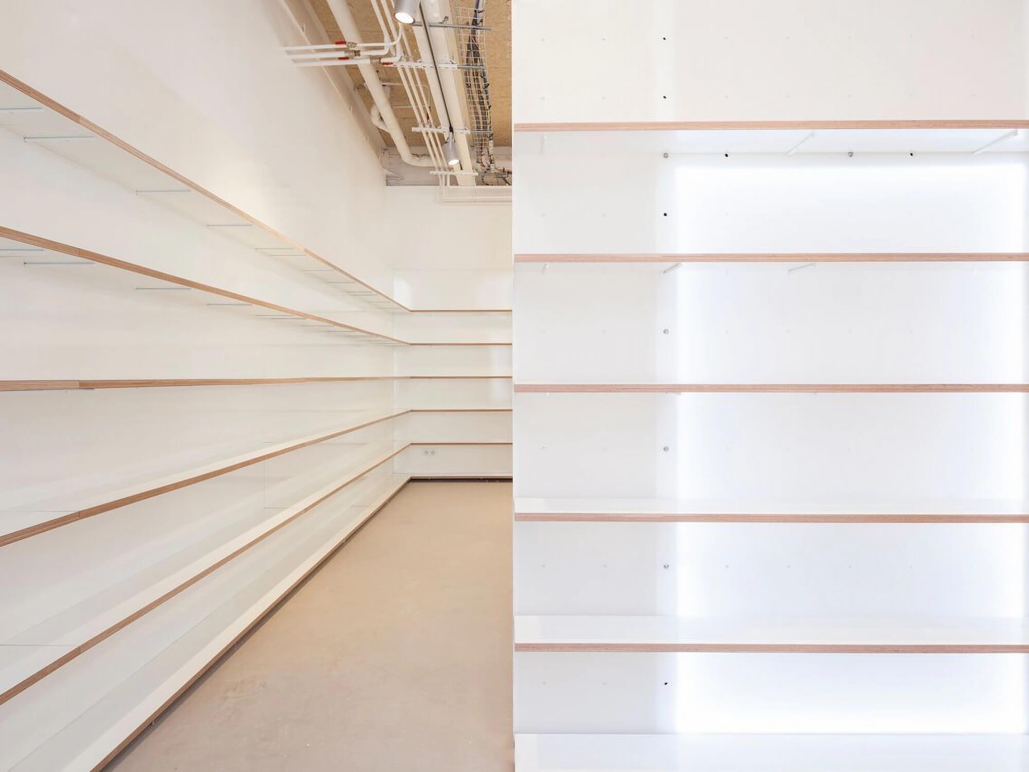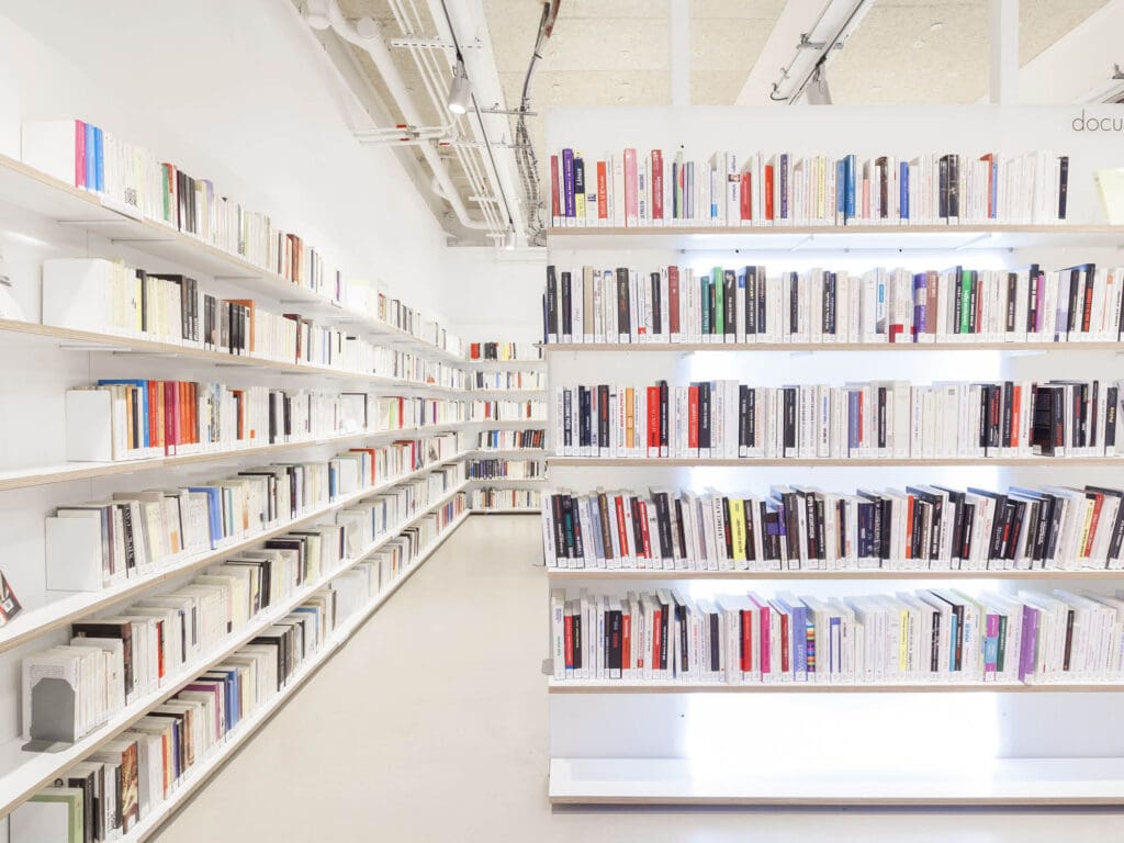 Le café surélevé permet de voir le grand espace depuis un vitrage acoustique, qui garantit le calme de la médiathèque. En contrebas viennent se développer l’espace vente et la médiathèque autour d’un grand meuble central, qui fait également office de coupure acoustique.