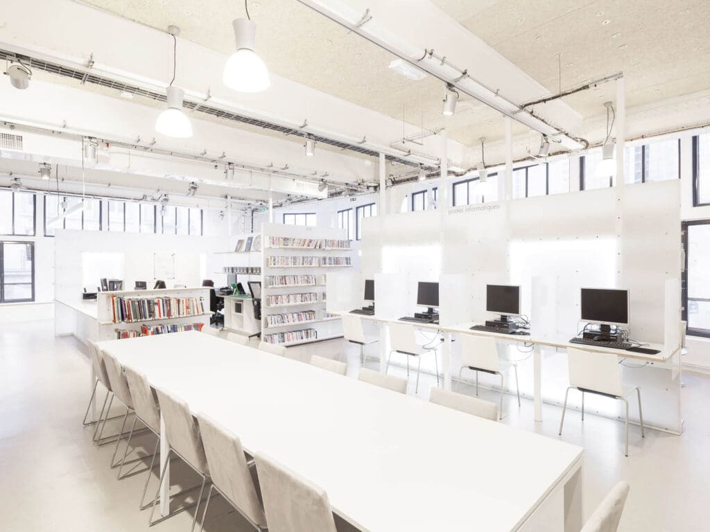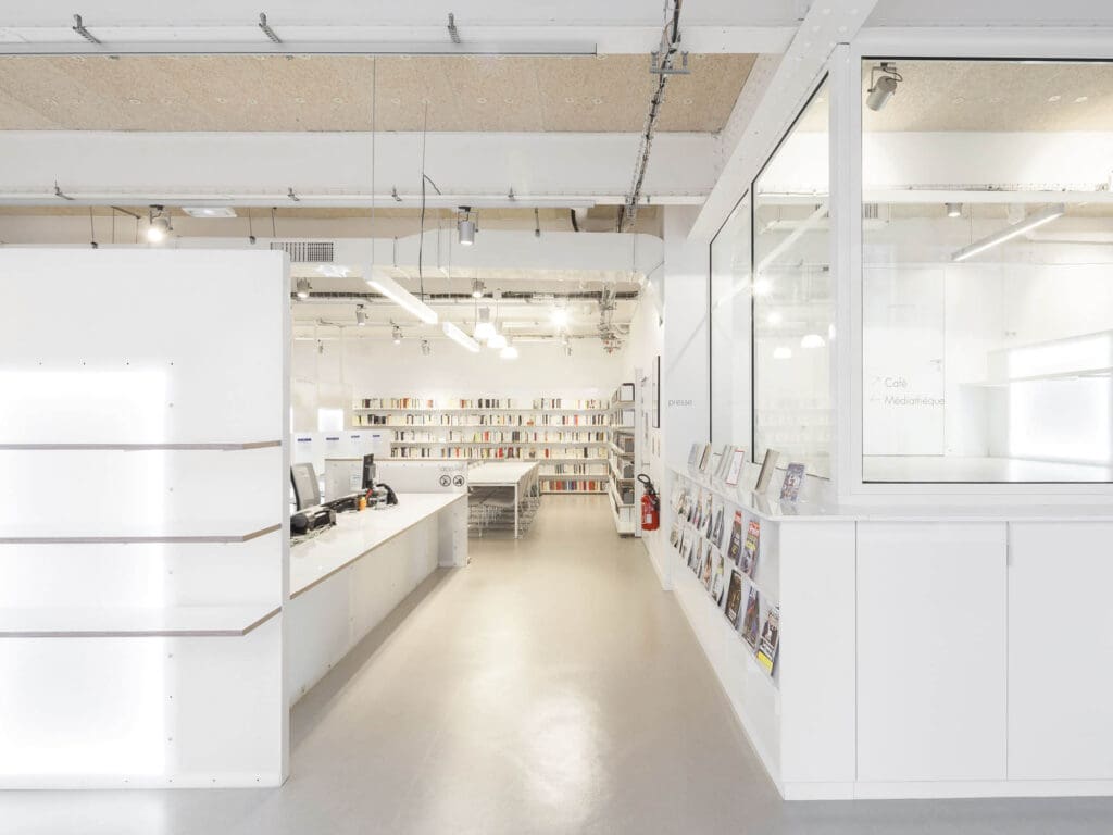 Le personnel de la préfecture de police viendra à la médiathèque pour se couper des contingences du quotidien : ainsi le rétroéclairage du mobilier par bandeaux de LED crée une atmosphère immatérielle, un ailleurs où le temps semble suspendu et où la lumière prend des matières singulières. Entre plafond brut révélant la structure historique du bâtiment, les réseaux apparents et le mobilier posé au sol, une hybridité particulière fabrique l’identité de cet ailleurs.