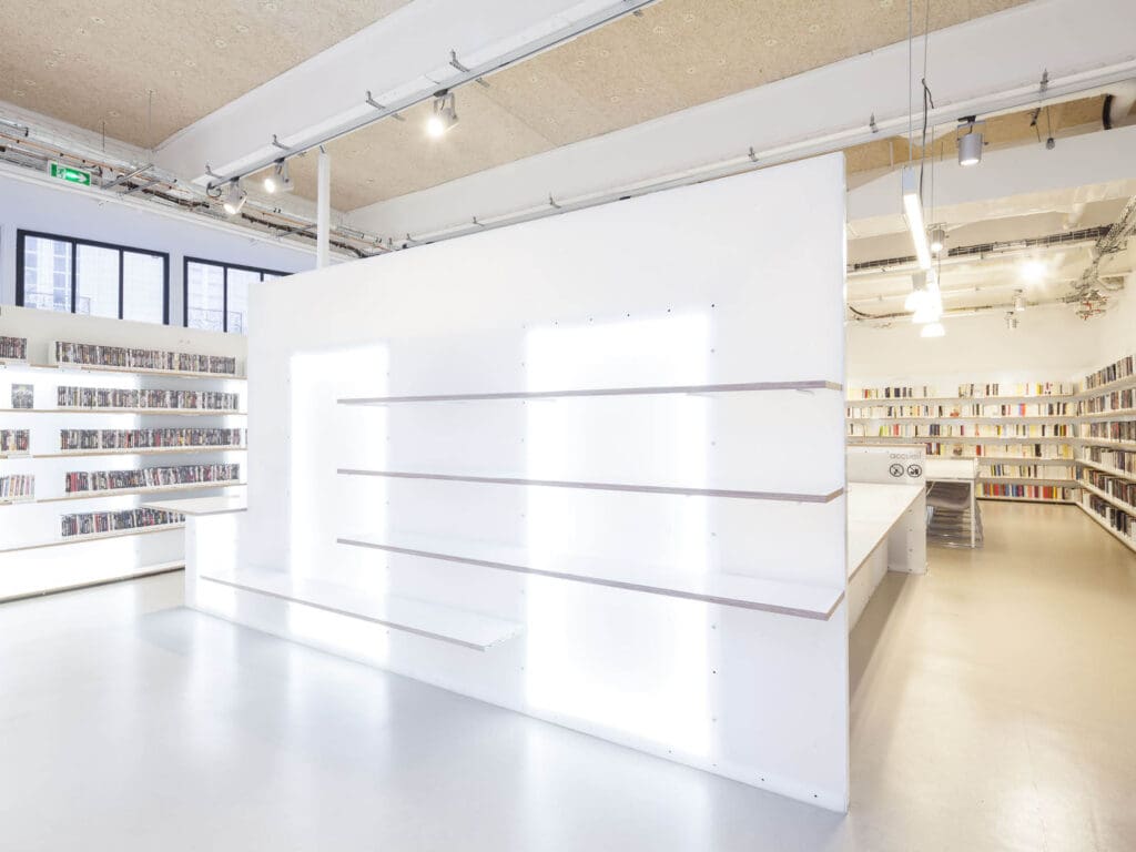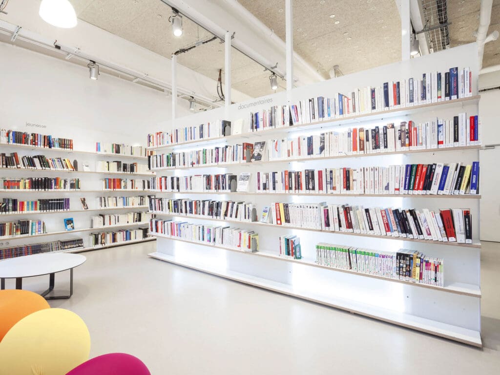Le café surélevé permet de voir le grand espace depuis un vitrage acoustique, qui garantit le calme de la médiathèque. En contrebas viennent se développer l’espace vente et la médiathèque autour d’un grand meuble central, qui fait également office de coupure acoustique.