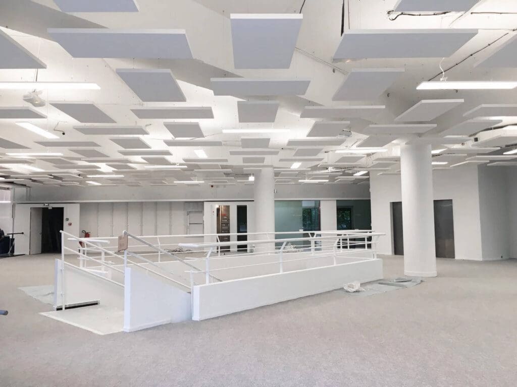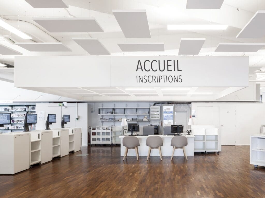 Au titre de la mise en accessibilité du bâtiment, elle intègre des interventions sur les blocs sanitaires et sur le mobilier. Au titre du confort lumineux et acoustique, et d’une maintenance plus aisée en plafond, elle entraîne un projet global pour la dépose et la réfection des plafonds sur tous les niveaux du bâtiment.