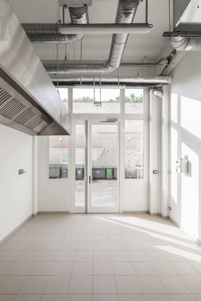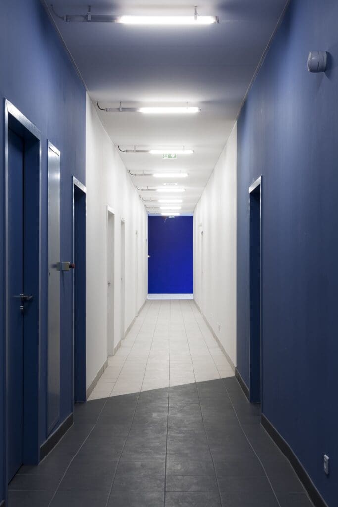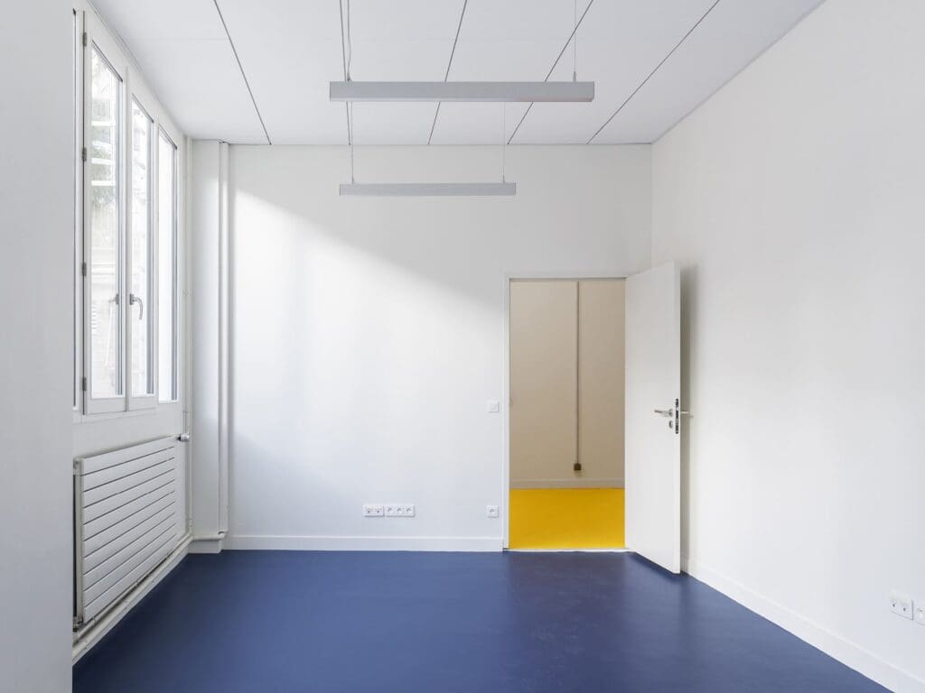 Le bureau profite aussi de ces larges fenêtres. Les sols des locaux techniques et de stockage est peint en jaune vif, tandis que le couloir principal a fait l’objet, par un traitement de couleurs et par le rythme de luminaires, d’un travail sur la perception de la profondeur.