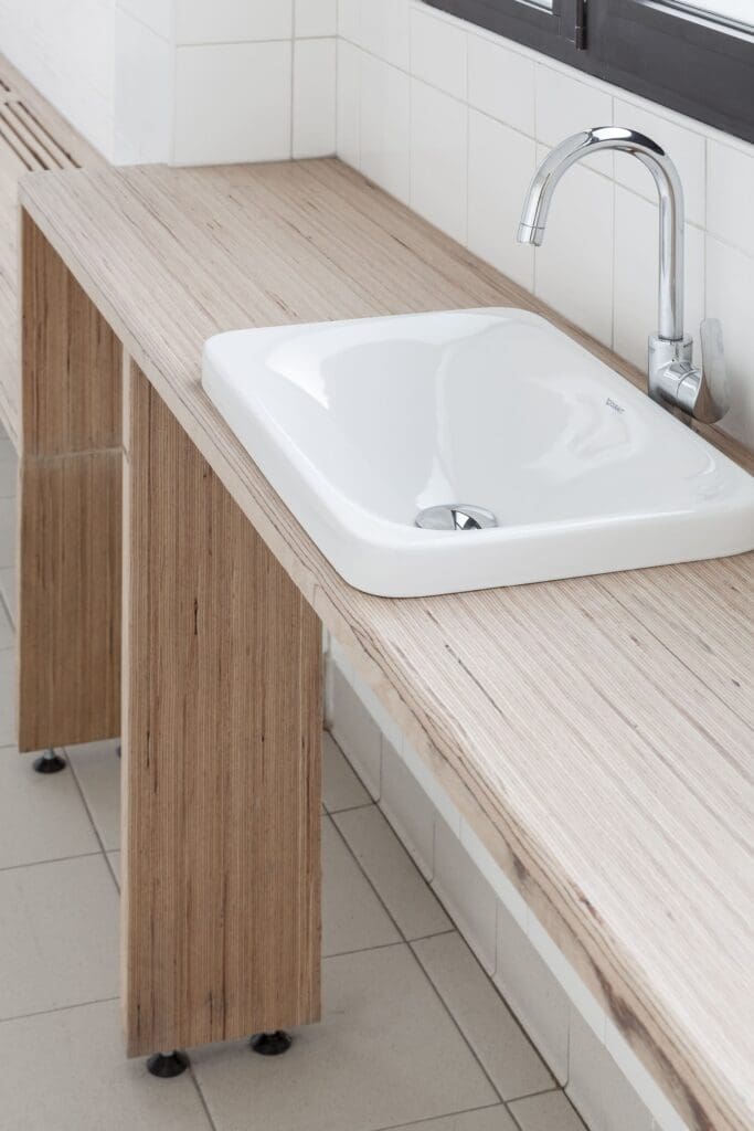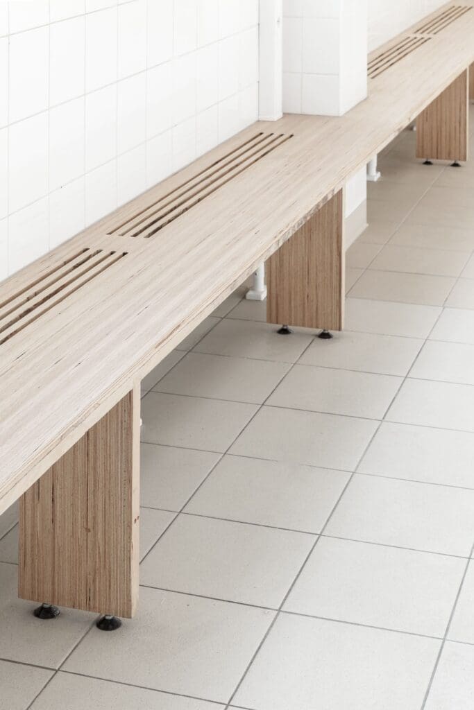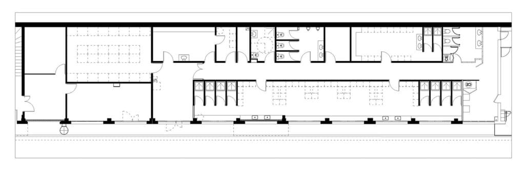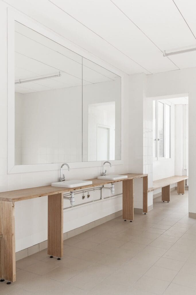 Le vestiaire principal se développe le long de la façade sur cour. Conçu pour accueillir 42 personnes, il tire parti d’un éclairement naturel abondant et accentue sa longueur par des rythmes dans le calepinage des carrelages et du plafond blancs, ou dans l’implantation à venir des casiers. Un grand miroir, dans leur prolongement, imite les vastes fenêtres longées d’une banquette menuisées laissant place à des lavabos. Aux deux extrémités du vestiaire, une série de douches allonge encore la perspective.