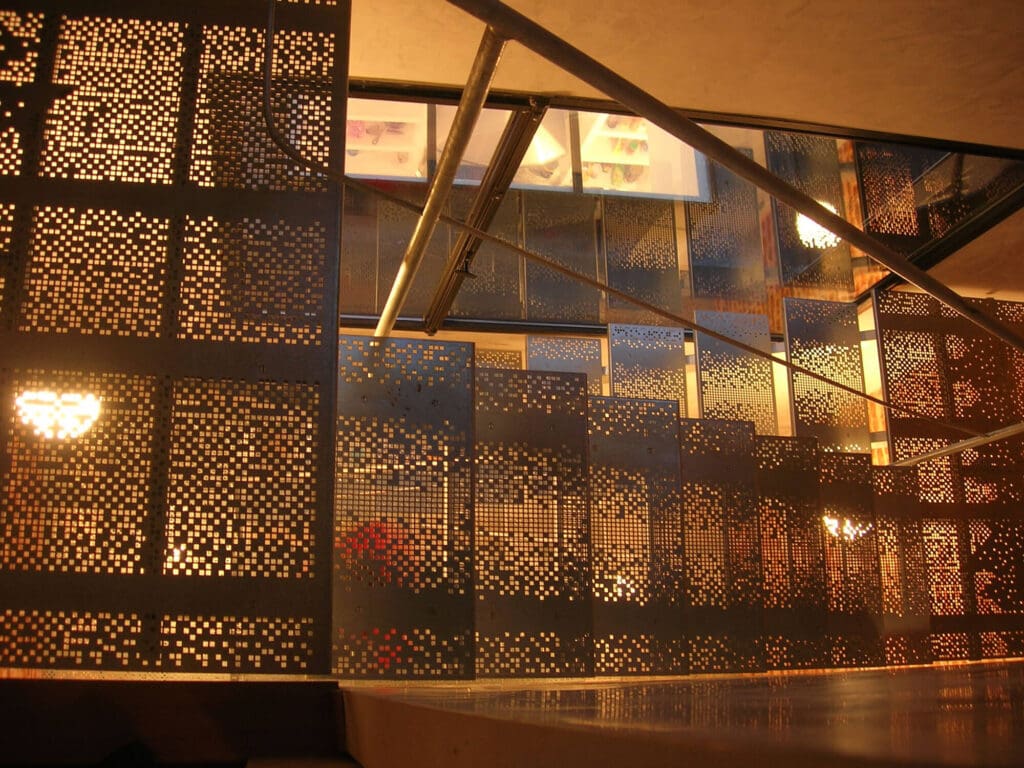 Les paliers reprennent ce procédé et supportent des luminaires en suspension. L’ajourage des marches accentue la porosité entre les niveaux et fait jouer la lumière et la matière. De plus, le motif de dimension réduite redonne une échelle domestique aux six volées répétitives de type industriel. L’escalier est ainsi une pièce unique qui marque l’intervention contemporaine et participe à la personnalisation de la maison. C.S.-P